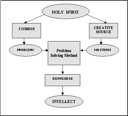 The teaching system of the Holy Spirit is set out in diagram 1. The system is designed to develop souls which is synonymous with intellectual development. The Holy Spirit teaches by experience. The Spirit gives the problems of experience and also gives the solutions to the problems in the form of understandings. The combination of problems and solutions is necessary to intellectual development since the intellect must understand the problem before it can understand the solution. The Cosmos, which is the creation of the Holy Spirit, is a source of the problems of experience, and the Creative Source, otherwise called the Interior Master, the Light of Reason, and the Inner Light, which is a function of the Spirit, is the origin of the solutions or understandings.