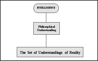Le Compte des Understandings L'intellect comporte un ensemble des understandings qui est équivalent à la bibliothèque des programmes maintenus dans un ordinateur et il donne la fonctionnalité exigée par des individus pour fonctionner dans le monde. Les understandings modèlent le monde de l'expérience L'understanding est une représentation de réalité comme experimenté, et l'ensemble des understandings modele le monde comme experimenté par l'individu. L'understanding est créé, ou modifié, comme le résultat de la solution d'un problème d'expérience. Une fois qu'un problème particulier a été résolu dans un intellect les moyens de traiter des répétitions du même problème existent dans cet intellect en tant que routines automatiquement appelées sous forme d'understandings. Les problèmes perçus avec la réalité provoquent les modèles qui essayent d'émuler cette réalité. Si le modèle reflète exactement la réalité comme experimenté, les prévisions basées sur ce modèle sera le plus précis. Les explications valides des ensembles d'expériences, basés sur les modèles précis, constituent la connaissance, et provoquent des comportements corrects et efficaces, mentaux et physiques. Le modèle ou les modèles émulent la réalité donnée dans l'expérience, et transforment dynamiquement un état de problème en état de solution. La définition